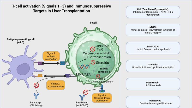 - Liver transplant immunosuppression is best understood through the three-signal model of T-cell activation, with each major drug class mapping onto at least one signal.