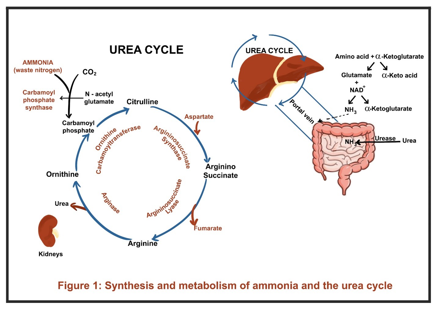- Ammonia travels via the portal circulation to the liver, where the urea cycle converts it into urea, a water-soluble and less toxic molecule (Figure 1). Urea is then transported to the kidneys and excreted.