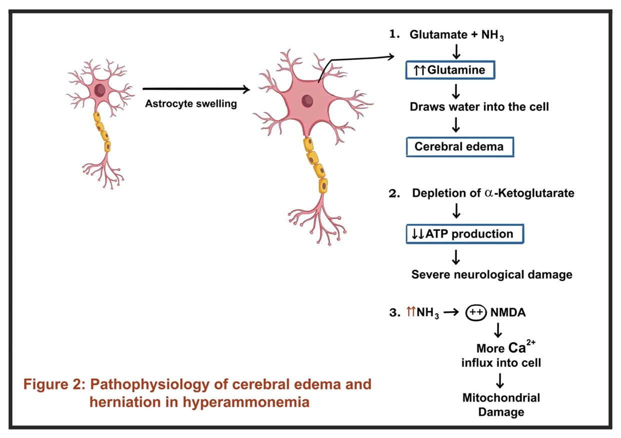 Ammonia is a byproduct of protein metabolism, detoxified mainly by the liver through the urea cycle and glutamine synthesis. Hyperammonemia occurs when these pathways are impaired, due to congenital or acquired hepatic and non-hepatic causes. It is important to get a detailed history, and consider the various causes of hyperammonemia, especially in a patient presenting for the first time, without obvious liver disease. Elevated ammonia disrupts brain function via astrocytic glutamine accumulation, neurotransmitter imbalance, and cerebral edema. Management focuses on correcting triggers, reducing ammonia production, enhancing excretion, and in severe cases, using dialysis or shunt embolization