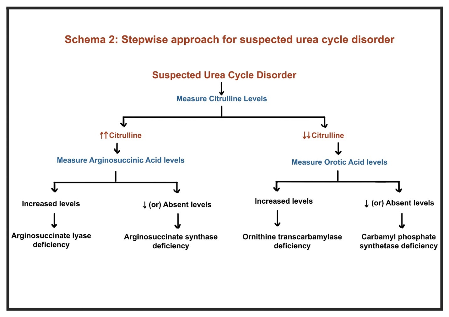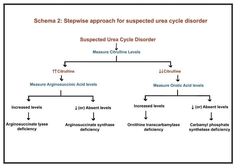 - In patients without liver disease, stepwise evaluation should include arterial pH, serum ketones, glucose, amino acid profiles, and genetic testing for UCDs (Schema 2)