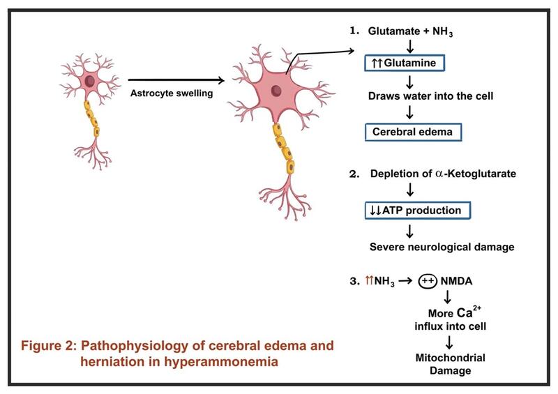 Acute liver failure: In acute liver failure, hepatocellular dysfunction and loss of functional hepatic mass result in a marked reduction in urea cycle activity, causing ammonia to accumulate in the systemic circulation. The consequences of rapid rise in ammonia levels are described below.