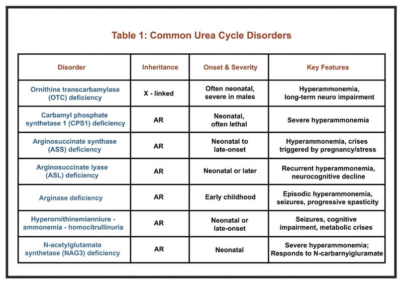 UCDs are inborn errors of nitrogen detoxification caused by defects in the urea cycle enzymes or transporters. They typically present in the neonatal period, most often within the first few days after birth in cases of severe enzyme deficiency. These neonates appear normal at birth but rapidly develop signs of hyperammonemia such as poor feeding, vomiting, lethargy, and progression to coma if untreated.