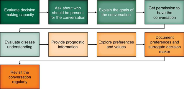 Advance Care Planning (ACP) is a proactive, ongoing, collaborative process of decision making about health care values, goals, and healthcare preferences. It is associated with improved end-of-life outcomes, including satisfaction with care, for serious illnesses. A roadmap for these conversations is shown below, and it spans from helping patients understand their illness to discussing prognosis, values, goals, and preferences, and, finally, documentation. In hepatology, ACP should start at the time of diagnosis of cirrhosis and preferably occur before hepatic decompensations and loss of decision-making capacity.