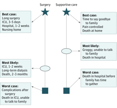 - Walk patient and loved ones through the best, worst, and most likely outcome of pursuing each treatment option