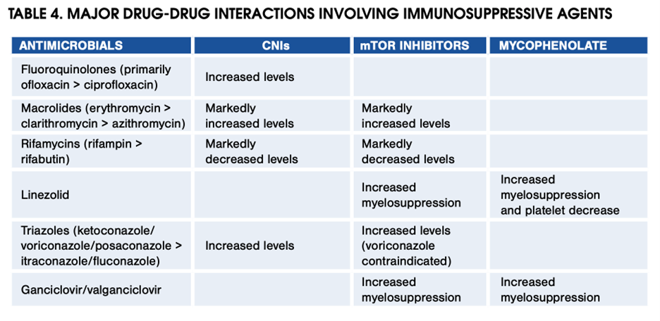CNIs are started early post-transplant and continued with or without additional immunosuppression agents. Dosing is guided by trough levels, with target levels based on time interval post-transplant and patient-specific factors. CNIs are metabolized via CYP450 and prone to drug interactions. The table below highlights key interactions that clinicians should keep in mind.