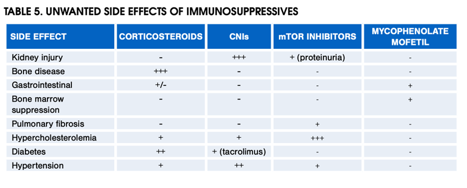 Check out the table below for the side effect profiles of the various maintenance immunosuppression agents discussed thus far.