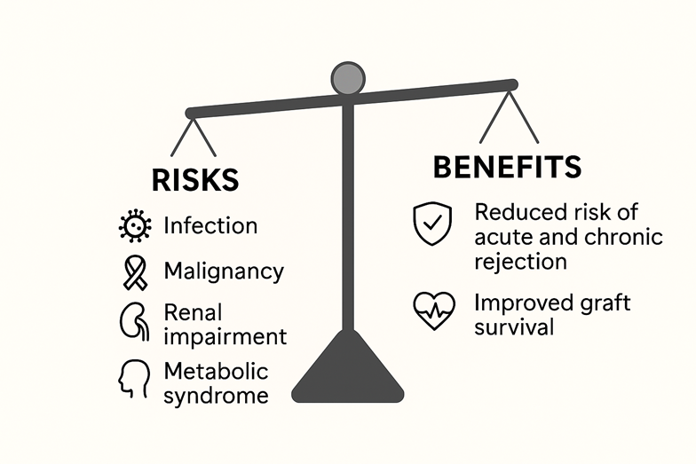 While essential for graft survival, immunosuppression carries risks, including infection, metabolic issues, malignancy, and organ-specific toxicities. The ideal regimen balances preventing rejection with minimizing side effects. Achieving this balance—the “art of immunosuppression”—requires individualized decisions based on factors like the transplant indication, comorbidities, and immunosuppression-related side effects.