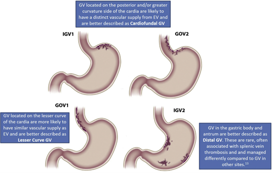 The American Gastroenterological Association (AGA) has proposed an alternative nomenclature for gastric varices (Figure 1), based on endoscopic location that also helps correlate with vascular imaging, simplifying gastric varices as lesser curve (GOV1), cardiofundal (GOV2, IGV1) and distal (IGV2).