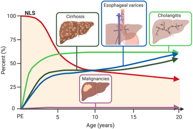 Fig. 1. Cumulative proportional occurrence of cirrhosis, esophageal varices, cholangitis and liver malignancies in relation native liver survival (NLS) from portoenterostomy (PE) to adulthood