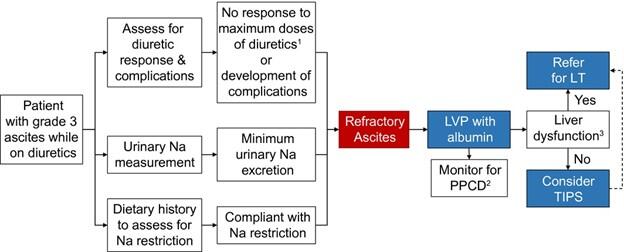 - Serial large-volume paracentesis (LVPs; arbitrarily defined as a paracentesis of > 5 L) with albumin to prevent post paracentesis circulatory dysfunction (PPCD; 6-8 g of albumin per liter of ascites removed). There is evidence showing inferior survival with LVPs when compared to TIPS in selected patients.