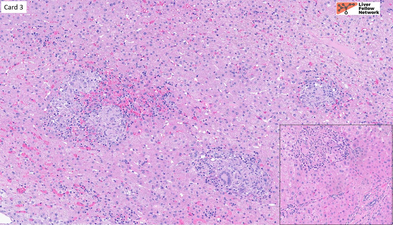 The dusky, distended gross appearance of the liver in A correlates nicely with the histology seen in B-D, characterized by extensive necrosis and hemorrhage centered around the central veins (“centrilobular”/zone 3), with encroachment of zone 2. Only a scant rim of periportal hepatocytes remains viable. Notably, there is relatively little inflammation given the extent of necrosis.