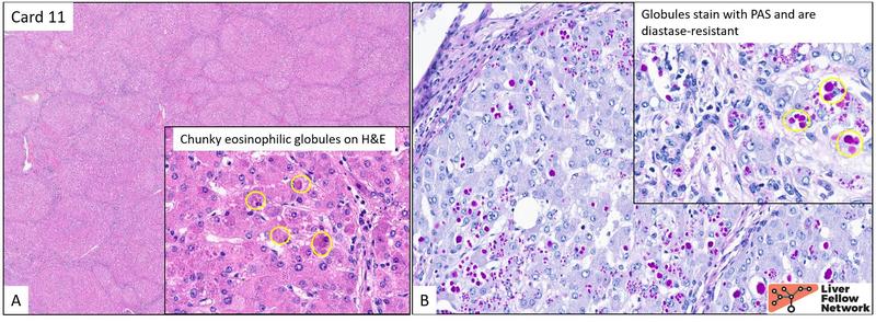 While somewhat nonspecific (other toxic agents, such as cocaine, may cause similar findings, and centrilobular necrosis is also a classic feature of “shock liver” in hypotensive patients), this constellation of clinicopathologic findings is consistent with acetaminophen-associated liver injury. The residual viable parenchyma shows some macrovesicular steatosis, which could fit with the history of alcohol use disorder; however, insufficient parenchyma is present for an accurate assessment of underlying liver disease.