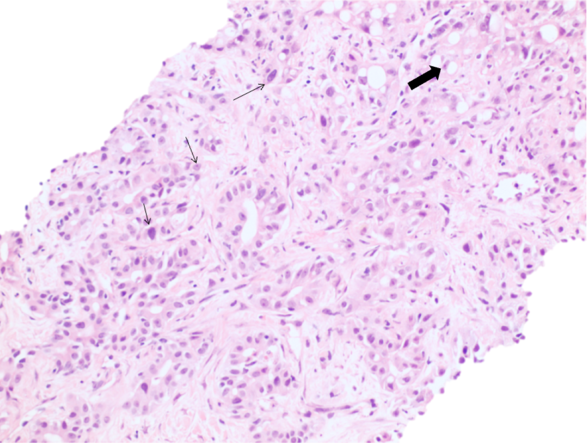 At low power, the liver core shows irregular angulated glands and single cells in a background of abundant desmoplastic stroma. (Figure 1 and 2). At high power the cells display varying degrees of cytologic atypia (Figure 3), consistent with a moderate to poorly differentiated adenocarcinoma. Immunohistochemical stains for CK7 (Figure 4) and CK19 (Figure 5) are positive. Immunohistochemical stains for Glypican-3, Arginase-1, CK20, GATA3, PAX-8 and CDX-2 are negative. In the clinical context of a single central intrahepatic lesion with absence of lesions in the rest of the body, the histologic findings are compatible with intrahepatic cholangiocarcinoma.