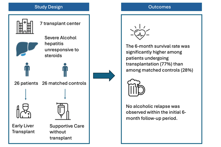 The intervention group received liver transplantation before completing the traditional 6-month waiting period, while the control group—matched by age, sex, Maddrey's discriminant function, and Lille score—received standard care without transplantation. The study measured 6-month survival as the primary outcome and return to alcohol use as the secondary outcome.