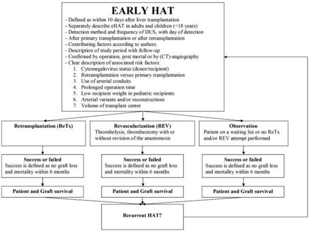 The cornerstone of early HAT treatment includes urgent revascularization and retransplantation if this is not successful. Recently published practice guidelines by the AASLD and AST recommend that hepatic artery complications should be managed urgently to avoid graft loss with the use of surgical/percutaneous endovascular intervention or anticoagulation.