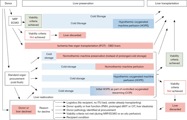 Machine perfusion can be performed at three time points; (1) immediately afterorgan procurement, before static cold storage, (2) shortly prior to organ implantation, and (3) for the entire preservation period between procurement and implantation. Schlegal et al describe below in the following diagram the complexity of the potential perfusion timing logistics.