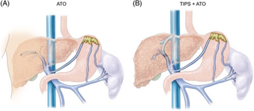 Anterograde transvenous obliteration targets the portal venous inflow that feeds a gastric varix as opposed to the systemic venous outflow that drains it in RTO. The portal venous system is accessed either percutaneously through the liver (left figure below) or spleen, or more commonly, in conjunction with a TIPS (right figure below). The inflow branches of the portal or splenic veins that feed the gastric varix are then treated with sclerosant, embolizing agents, glue, coils, or plugs. ATO is used either as an adjunct or alternative to RTO when a gastrorenal shunt is not present. Coagulopathy and splenic or portal vein thrombosis are contraindications.
