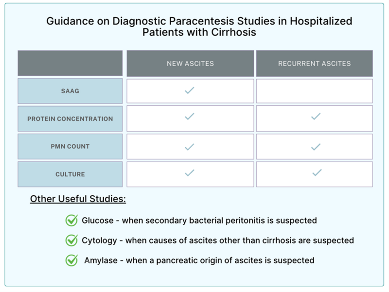 - Perform a diagnostic paracentesis on all patients with cirrhosis and ascites admitted non-electively — even if the reason for admission is unrelated to liver disease.