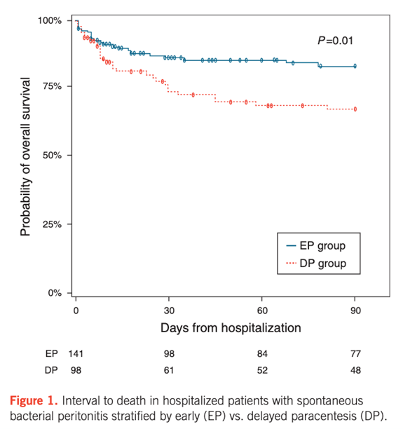 In another study, Kim et al demonstrated that hospitalized patients with SBP who received a delayed paracentesis (12-48 hours after hospital admission) specifically had a 2.7- fold increased mortality risk. In a group of 239 patients with SBP, those who had an early paracentesis <12 hours from admission had lower in-hospital mortality, shorter intensive care days, and a lower 3-month mortality compared to those who had a delayed procedure.